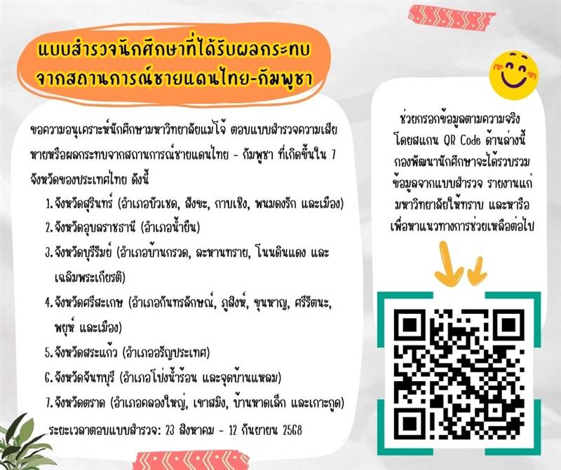 ตามที่ได้เกิดสถานการณ์ชายแดนไทย-กัมพูชา มีประชาชนได้รับผลกระทบเป็นจำนวนมาก กองพัฒนานักศึกษา จึงเห็นถึงความสำคัญในการสำรวจข้อมูลนักศึกษามหาวิทยาลัยแม่โจ้ที่ได้รับผลกระทบจากสถานการณ์ดังกล่าว