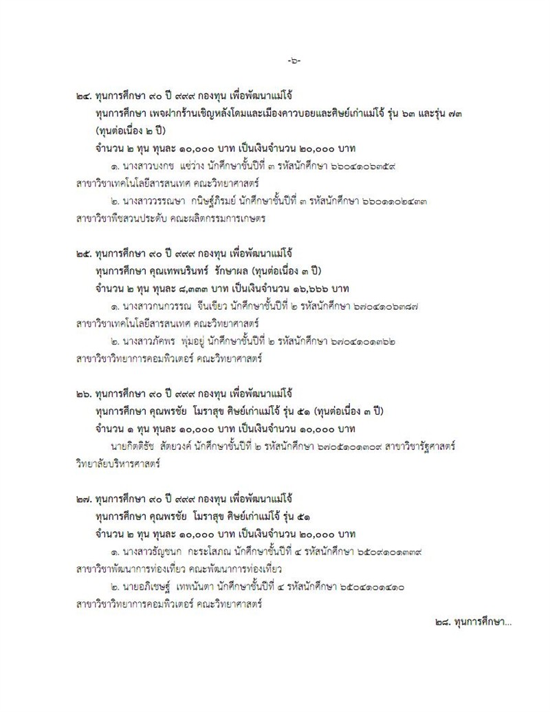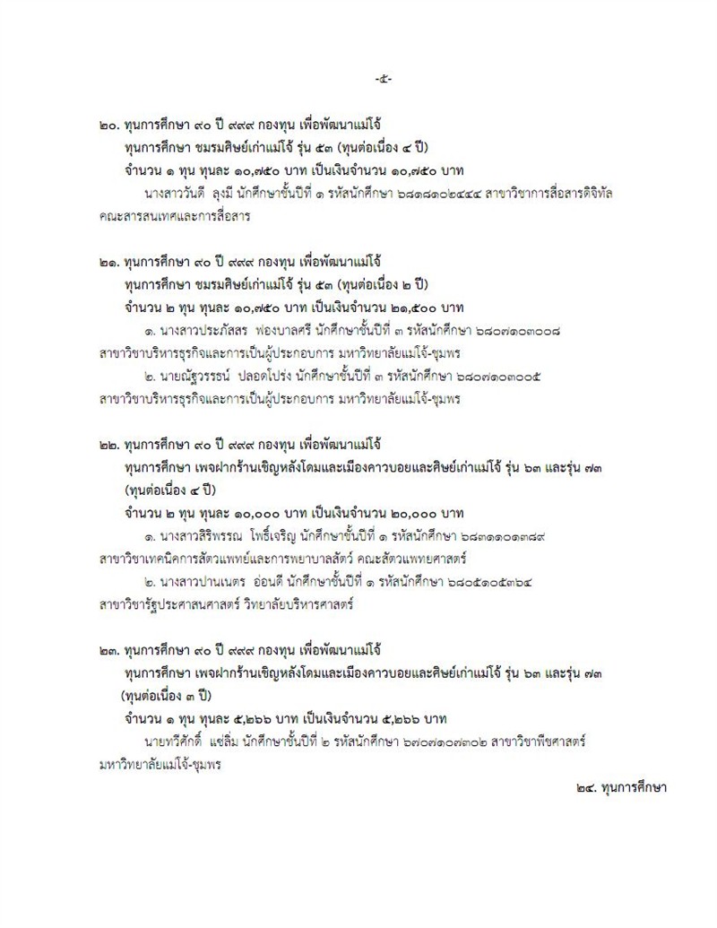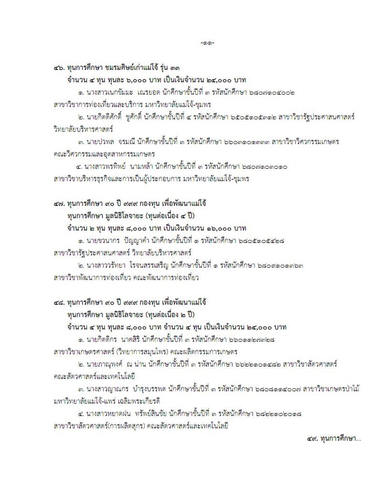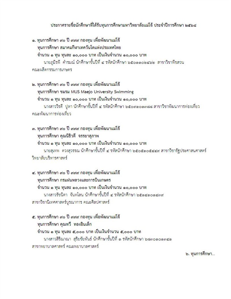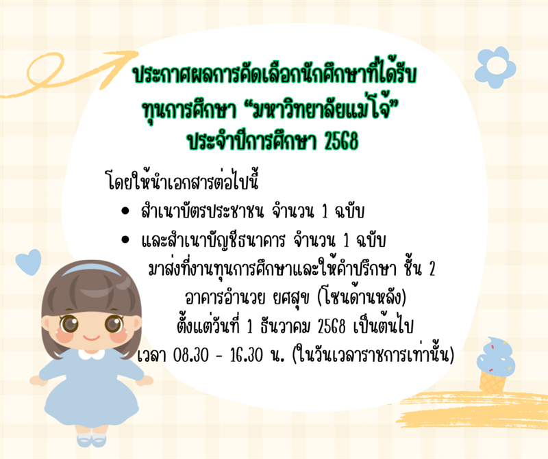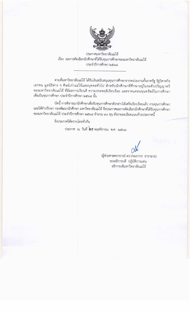 ??ประกาศผลการคัดเลือกนักศึกษาที่ได้รับทุนการศึกษามหาวิทยาลัยแม่โจ้ ประจำปีการศึกษา 2568